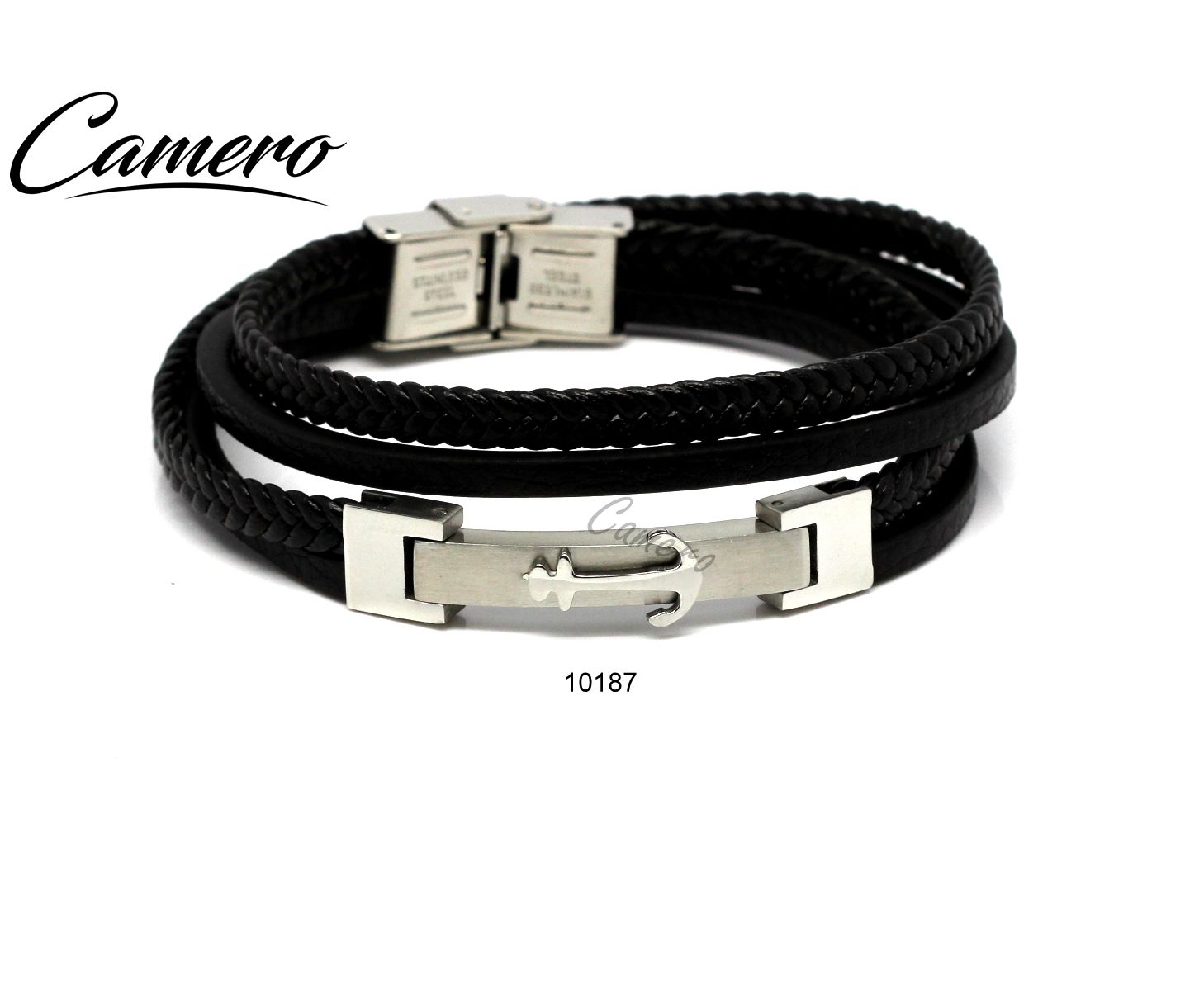 צמיד עור שחור עם סטיל ועוגן כסוף