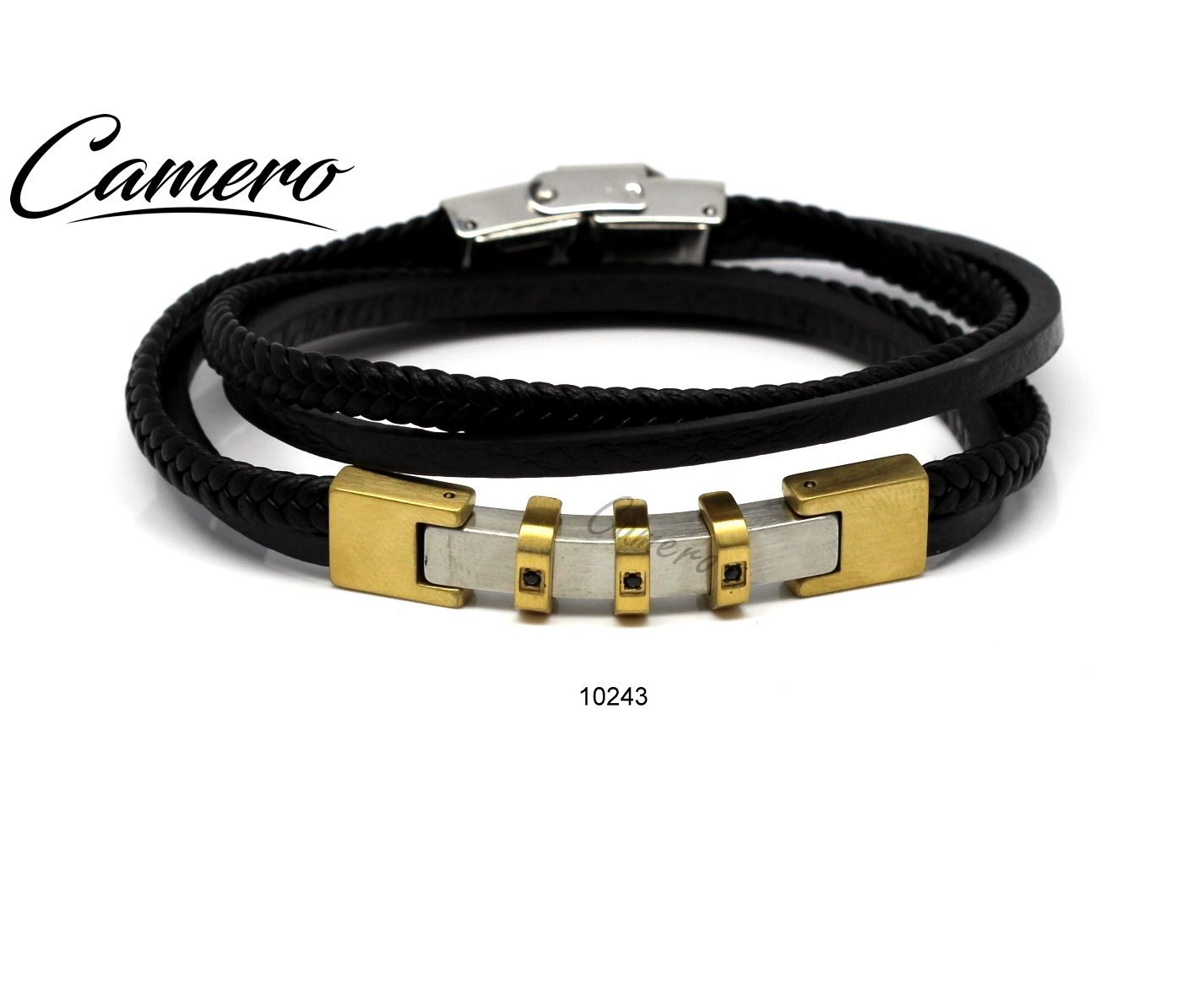 צמיד עור עם סטיל ו 3 אבנים שחורות