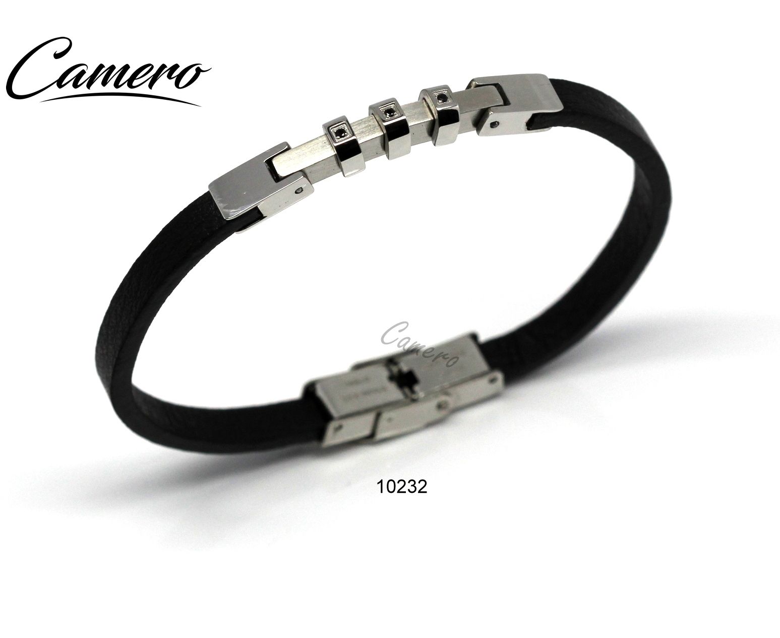 צמיד עור שחור וסטיל כסוף עם 3 אבנים