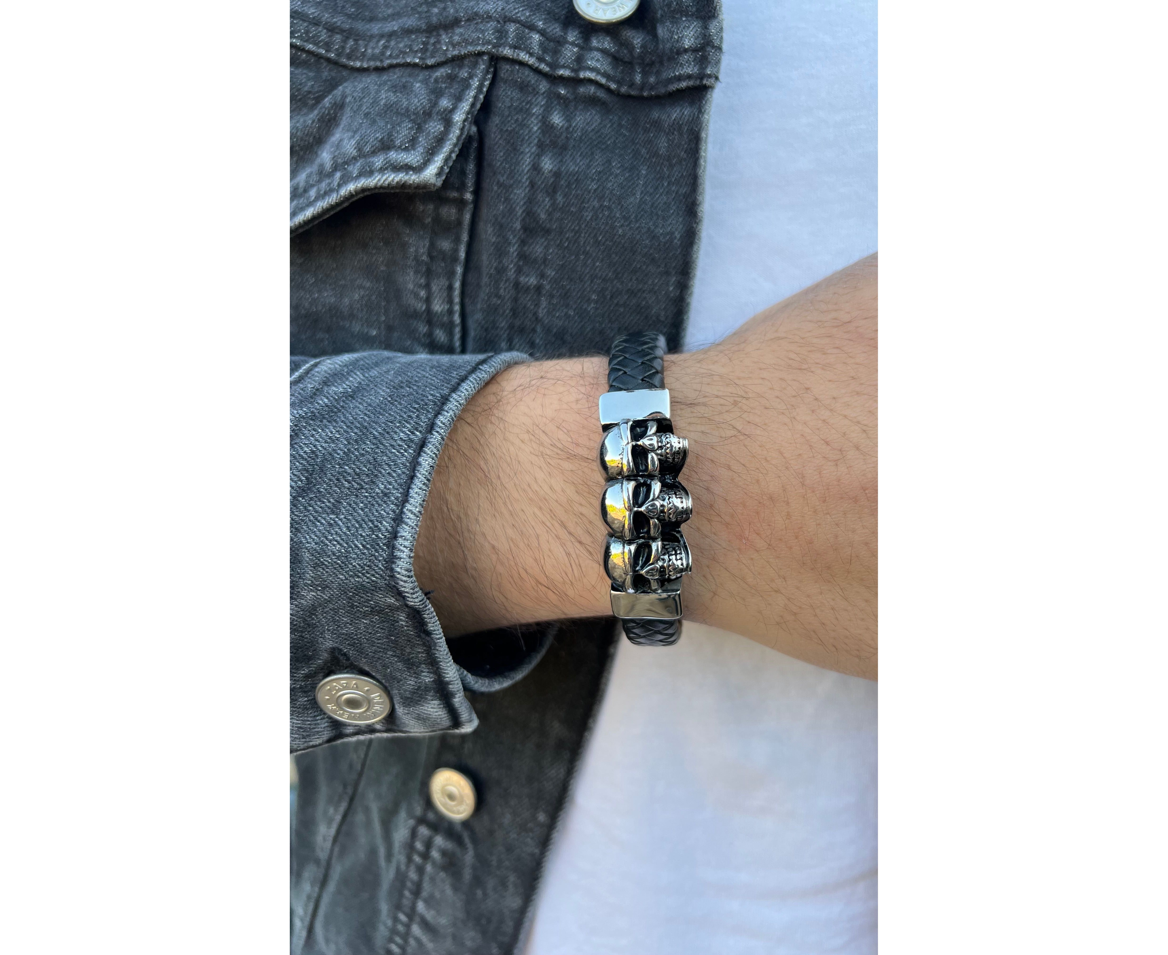 צמיד גולגולת לגבר משולב עור ולפלדה