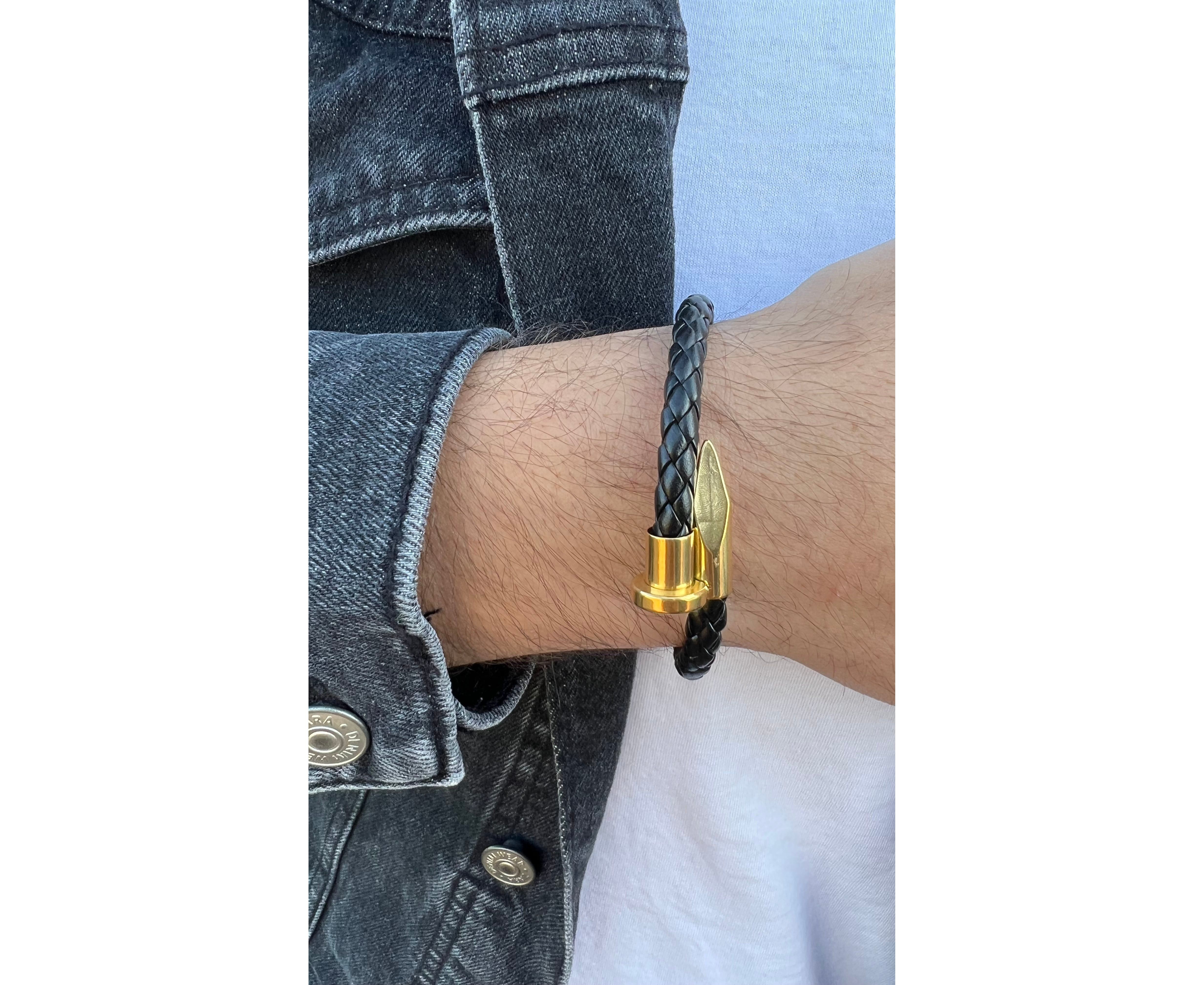 צמיד עור מסמר משולב פלדה עם ציפוי זהב 18k