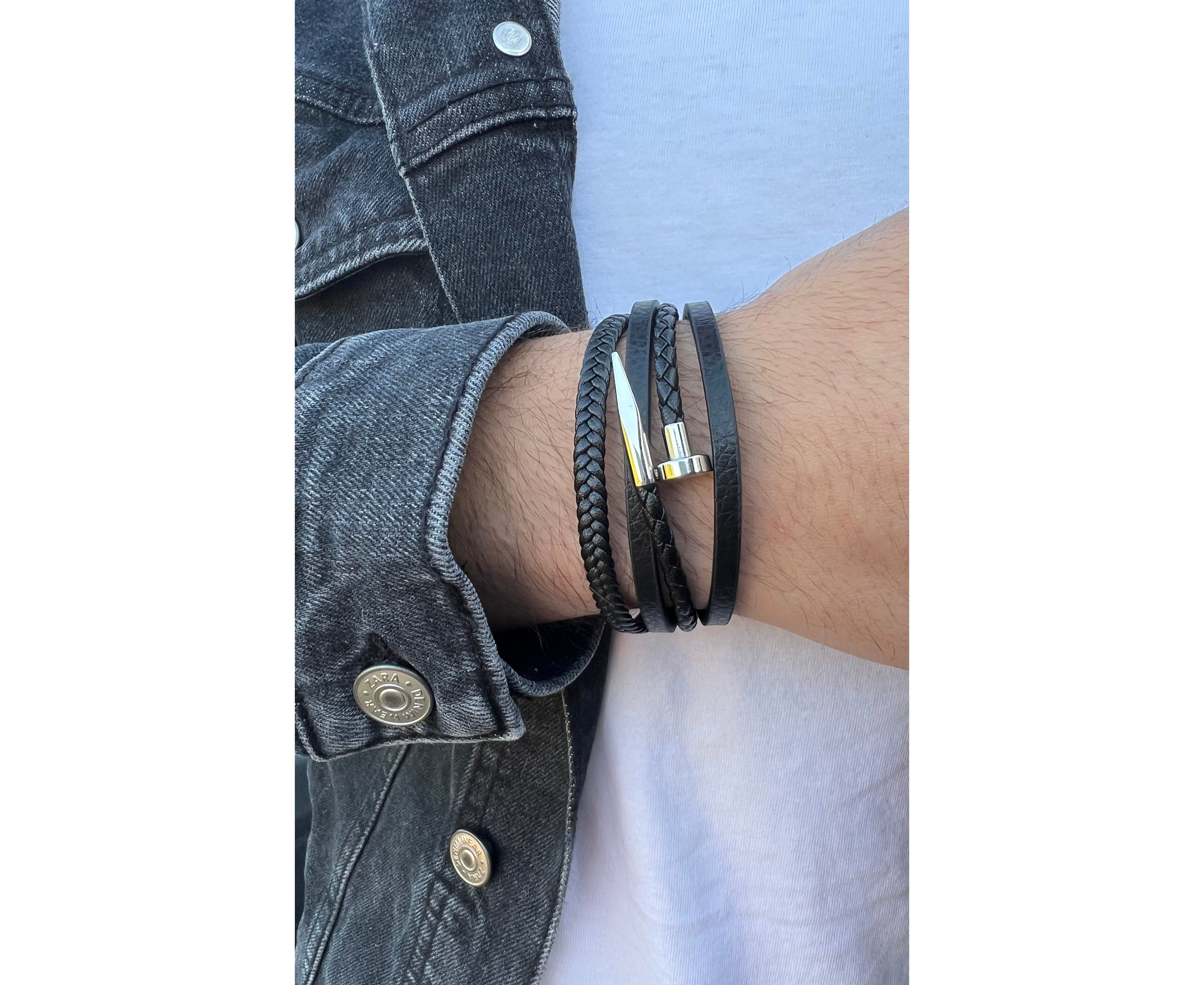 צמיד עור מסמר משולב פלדה איכותי לגבר