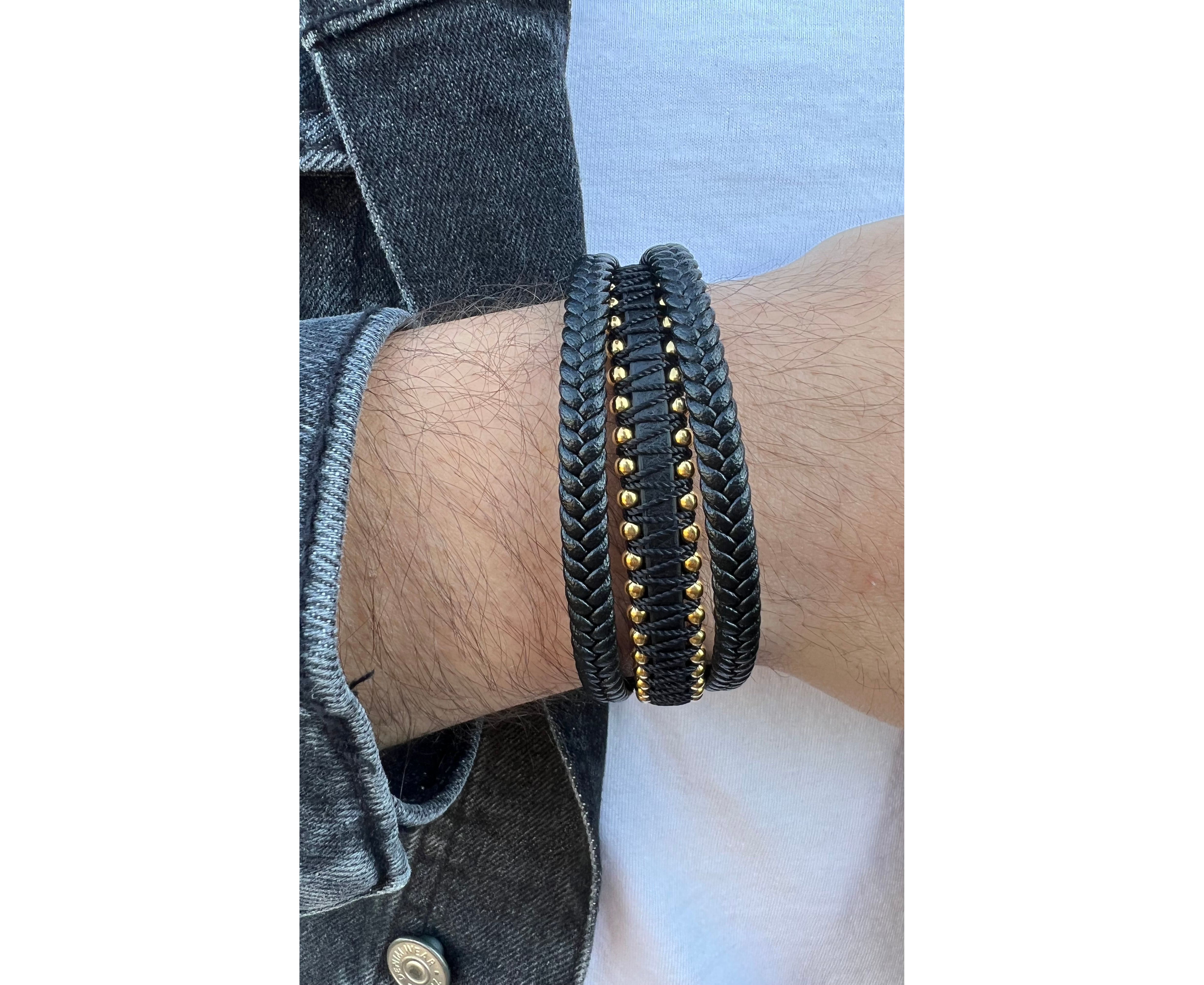 צמיד עור איכותי משולב פלדה ציפוי זהב 18k