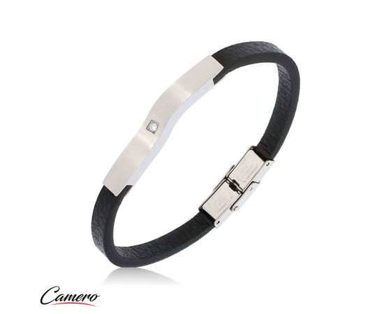 צמיד סטיל משולב עור פלטה כסופה+זירקון CAMERO
