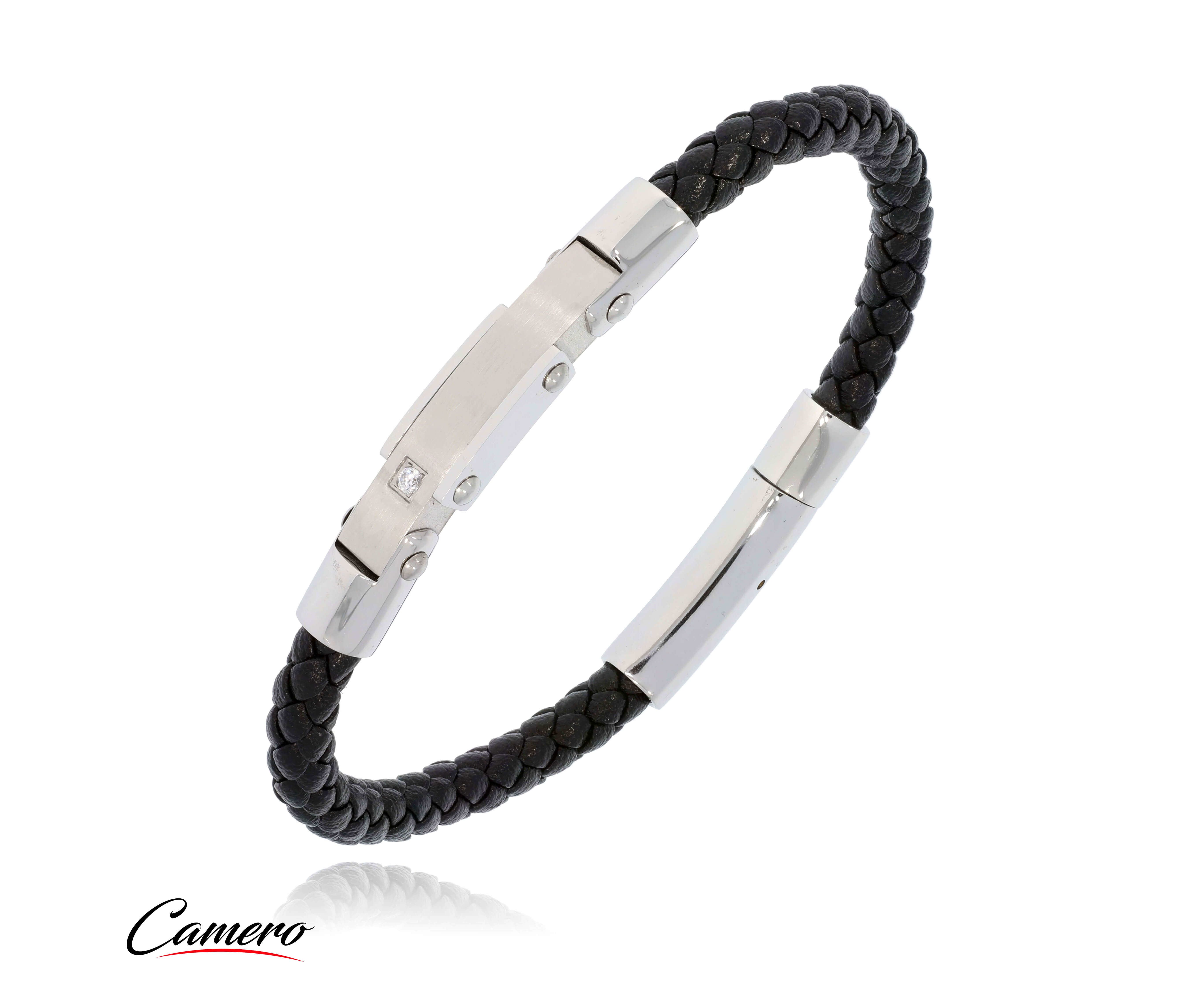 צמיד סטיל כסוף משולב עור עם זירקון CAMERO