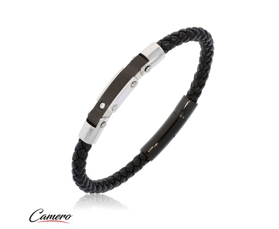 צמיד סטיל כסוף שחור משולב עור עם זירקון CAMERO